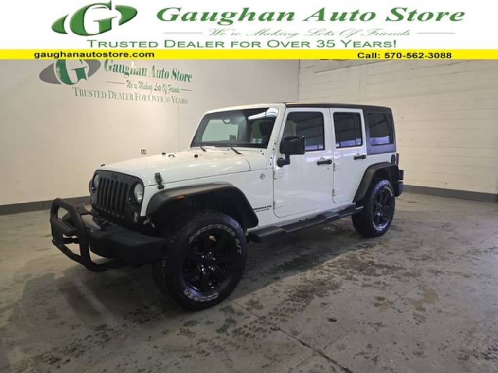Welcome to Gaughan Auto Store! We are an award winning dealership, voted #1 by a national warranty and national financial institution in customer satisfaction in North Eastern Pennsylvania! Our family has been selling quality pre-owned vehicles for 2 generations and have been a trusted dealer for over 25 years! Our vehicles are all vigorously checked by a 101 point inspection to ensure the quality and safety of not only our vehicles, but our customers as well! This Vehicle features Connectivity Group (Tire Pressure Monitoring Display and Vehicle Information Center), Dual Top Group (Premium Black Sunrider Soft Top), Quick Order Package 24L Altitude (Altitude Floor Mats, Altitude Hood Decal, Black Accent Stitching, Black Berber Cargo Mat w/Black Binding, Black High Gloss Exterior Mirror Cap, Black Jeep Grille Badge, Black Leather Seats w/Accent Stitch, Black/Chrome Screws Fuel Filler Door, Delete Sunrider Soft Top, Freedom Panel Storage Bag, Glossy Black Jeep Badge, Heated Front Seats, High Gloss Black Center Wheel Caps, Jeep Wrangler Altitude Edition, Leather Steering Wheel w/Black Stitch, Low Gloss Black Wrangler Decal, Piano Black Interior Accents, Rear Window Defroster, Rear Window Wiper/Washer, Satin Gloss Black Grille, Wheels: 18" x 7.5" 7-Spoke Painted Aluminum, and Wrangler Badge), Trailer Tow Group (Class II Receiver Hitch and Trailer Tow w/4-Pin Connector Wiring), GPS Navigation, Navigation System, 1-Year SIRIUSXM Travel Link Service, 18" x 7.5" Polished Satin Carbon Wheels, 4-Wheel Disc Brakes, 40GB Hard Drive w/28GB Available, 6.5" Touch Screen Display, 7 Speakers, ABS brakes, Air Conditioning, Air Conditioning w/Auto Temperature Control, Air Filtering, Alloy wheels, AM/FM radio, Anti-Spin Differential Rear Axle, Audio Jack Input for Mobile Devices, Auto-dimming Rear-View mirror, Brake assist, CD player, Cloth Bucket Seats, Compass, Driver door bin, Driver vanity mirror, Dual front impact airbags, Electronic Stability Control, Front anti-roll bar, Front Bucket Seats, Front Center Armrest w/Storage, Front fog lights, Front reading lights, Fully automatic headlights, Heated door mirrors, Heavy Duty Suspension w/Gas Shocks, Illuminated entry, Integrated roll-over protection, Leather steering wheel, Low tire pressure warning, MOPAR Jeep Trail Rated Kit, Occupant sensing airbag, Outside temperature display, Panic alarm, Passenger door bin, Passenger vanity mirror, Power door mirrors, Power steering, Power windows, Radio data system, Radio: Uconnect 130 AM/FM/CD/MP3, Radio: Uconnect 430N CD/DVD/MP3/HDD/NAV, Rear anti-roll bar, Remote keyless entry, Remote Start System, Remote USB Port, Security system, SIRIUSXM Travel Link, Speed control, Split folding rear seat, Steering wheel mounted audio controls, Supplemental Front Seat Side Airbags, Tachometer, Tilt steering wheel, Traction control, Trip computer, and Variably intermittent wipers.