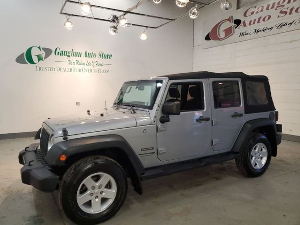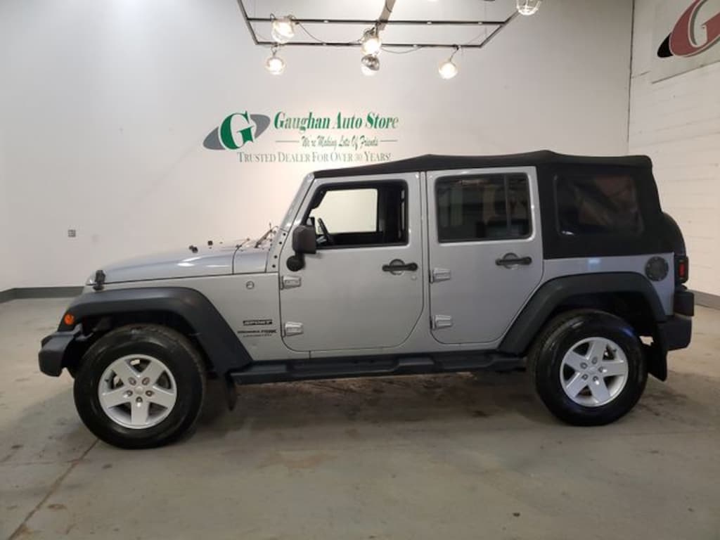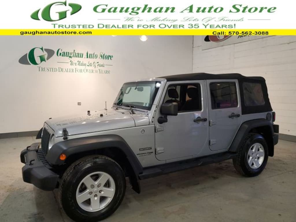 Welcome to Gaughan Auto Store! We are an award winning dealership, voted #1 by a national warranty and national financial institution in customer satisfaction in North Eastern Pennsylvania! Our family has been selling quality pre-owned vehicles for 2 generations and have been a trusted dealer for over 25 years! Our vehicles are all vigorously checked by a 101 point inspection to ensure the quality and safety of not only our vehicles, but our customers as well! This Vehicle features Connectivity Group (Tire Pressure Monitoring Display, Uconnect Voice Command w/Bluetooth, and Vehicle Information Center), Power Convenience Group (Auto-Dimming Mirror w/Reading Lamp, Front 1-Touch Down Power Windows, Power Heated Mirrors, Power Locks, Remote Keyless Entry, and Security Alarm), Quick Order Package 24S Sport S (17" x 7.5" Aluminum Wheels, Chrome/Leather Wrapped Shift Knob, Deep Tint Sunscreen Windows, and Leather Wrapped Steering Wheel), 1-Yr SiriusXM Radio Service, 16" x 7.0" Luxury Styled Steel Wheels, 3.21 Rear Axle Ratio, 4-Wheel Disc Brakes, 8 Speakers, ABS brakes, Air Conditioning, AM/FM radio, Audio Jack Input for Mobile Devices, Brake assist, CD player, Cloth Seats w/Adjustable Head Restraints, Compass, Driver door bin, Driver Height Adjuster Seat, Driver vanity mirror, Dual front impact airbags, Electronic Stability Control, Front anti-roll bar, Front Bucket Seats, Front Center Armrest w/Storage, Front fog lights, Integrated roll-over protection, Low tire pressure warning, Normal Duty Suspension, Occupant sensing airbag, Outside temperature display, Passenger door bin, Passenger vanity mirror, Power steering, Premium Black Sunrider Soft Top, R1234YF A/C Refrigerant, Radio: 130, Radio: 430, Rear anti-roll bar, Remote USB Port, Speed control, Split folding rear seat, Steering wheel mounted audio controls, Sunrider Soft Top, Tachometer, Tilt steering wheel, Traction control, Trip computer, and Variably intermittent wipers.